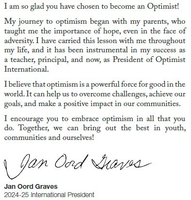 By providing hope and positive vision, Optimists bring out the best in youth, our communities, and ourselves.